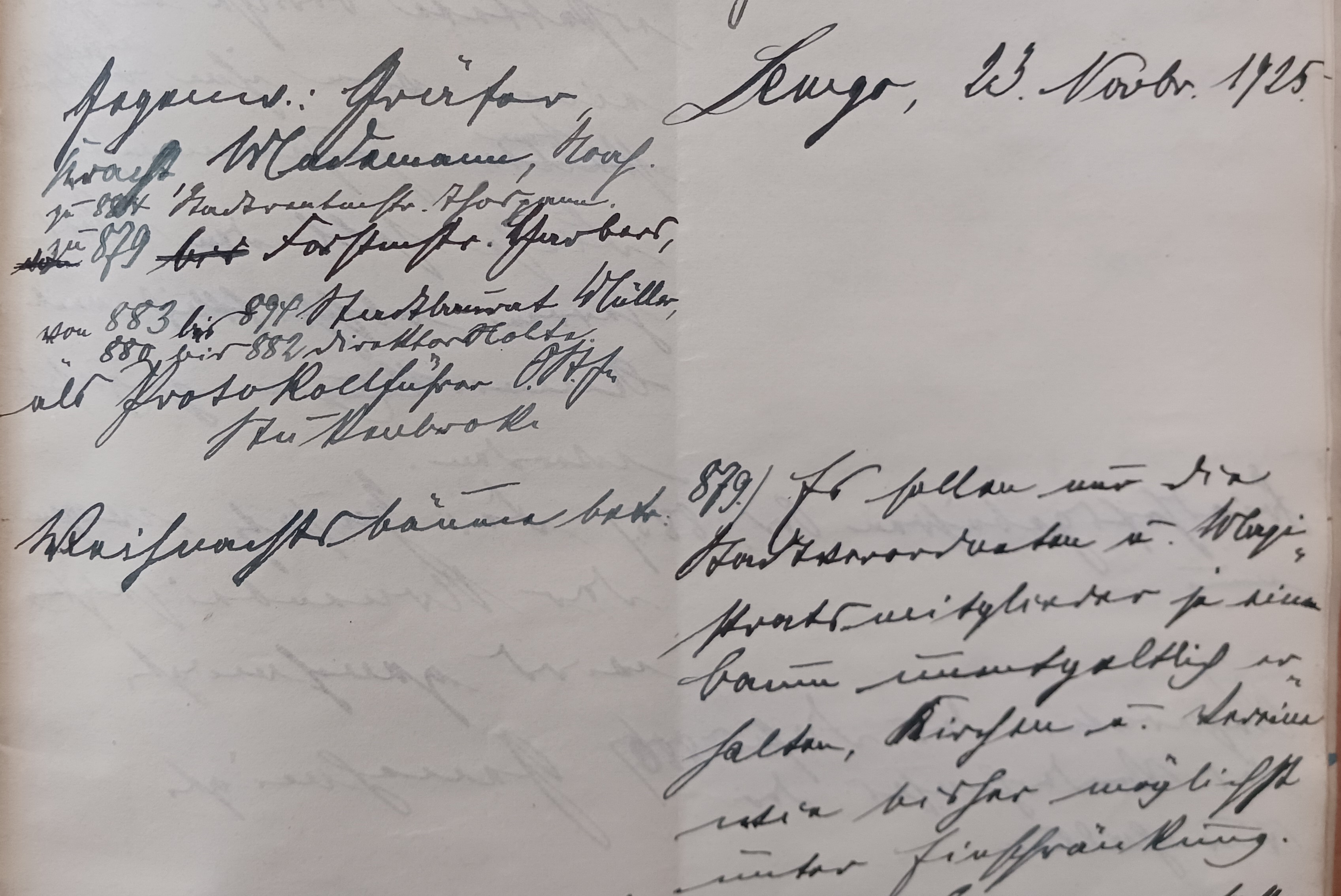 Vereinzelte Erwähnungen von Weihnachtsbäumen gibt es schon deutlich früher, doch erst im 19. Jahrhundert verbreitete und festigte sich die Tradition, zu Weihnachten geschmückte Tannenbäume aufzustellen. Wann genau der Tannenbaum mit Kerzen und Kugeln in Lemgo zum jährlichen Bild der Winterzeit wurde, ist (noch) nicht bekannt. Aber eventuell lohnt sich eine intensivere Nachforschung, denn Weihnachtsbäume waren auch Thema im Stadtrat. Am 23.11.1925 ist protokolliert: „Es sollen nur die Stadtverordneten und Magistratsmitglieder je einen Baum unentgeltlich erhalten. Kirchen und Vereine wie bisher möglichst unter Einschränkung“. Das „wie bisher“ deutet jedenfalls darauf hin, dass Weihnachtsbäume nicht zum ersten Mal auf der Tagesordnung standen. Vielleicht gibt es auch in weiteren Protokollbänden Wissenswertes zu Lemgoer Weihnachtsbäumen zu entdecken...