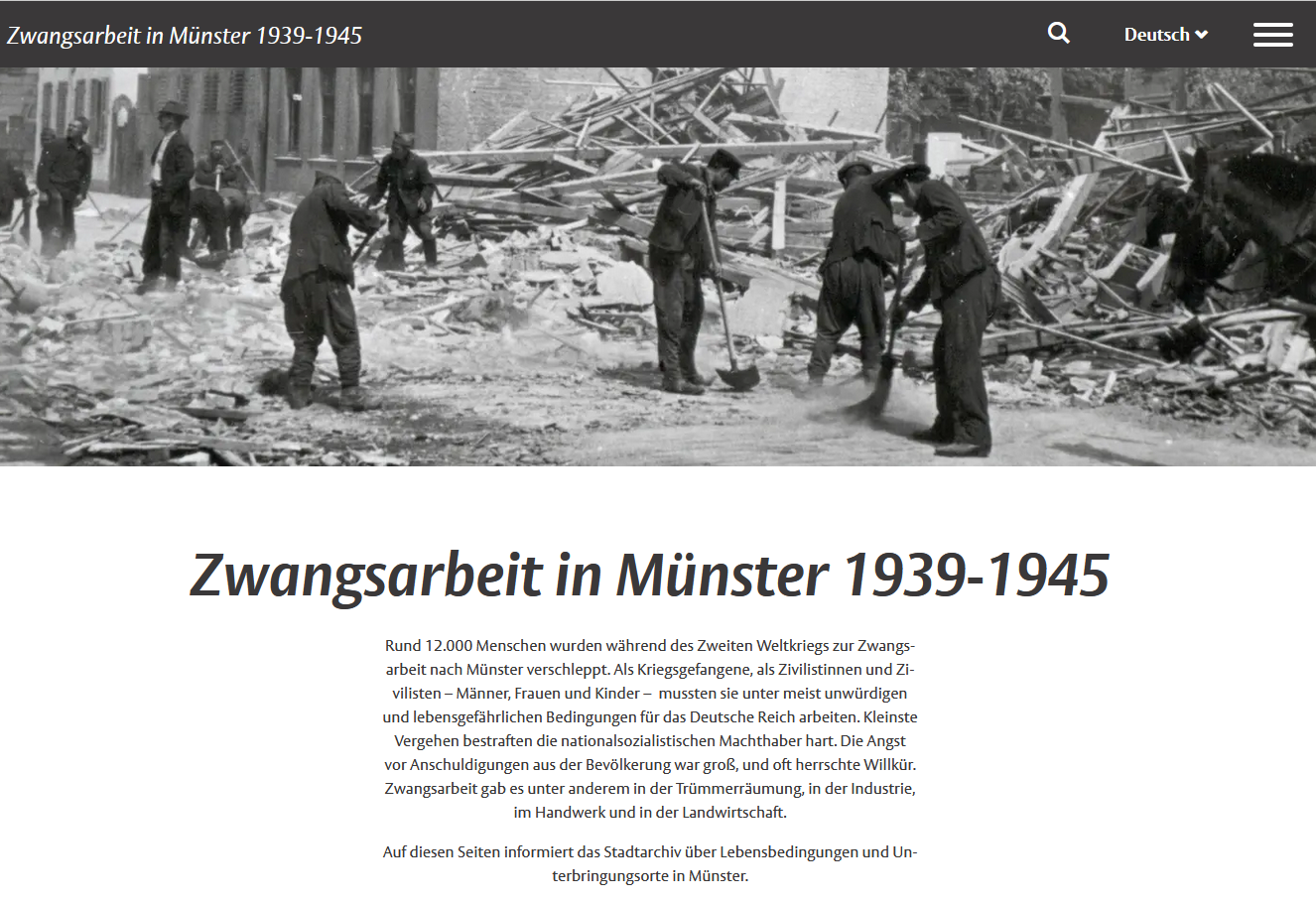 Rund 12.000 Menschen wurden während des Zweiten Weltkriegs zur Zwangsarbeit nach Münster verschleppt. Als Kriegsgefangene, als Zivilistinnen und Zivilisten – Männer, Frauen und Kinder – mussten sie unter meist unwürdigen und lebensgefährlichen Bedingungen für das Deutsche Reich arbeiten. Kleinste Vergehen bestraften die nationalsozialistischen Machthaber hart. Die Angst vor Anschuldigungen aus der Bevölkerung war groß, und oft herrschte Willkür. Zwangsarbeit gab es unter anderem in der Trümmerräumung, in der Industrie, im Handwerk und in der Landwirtschaft.