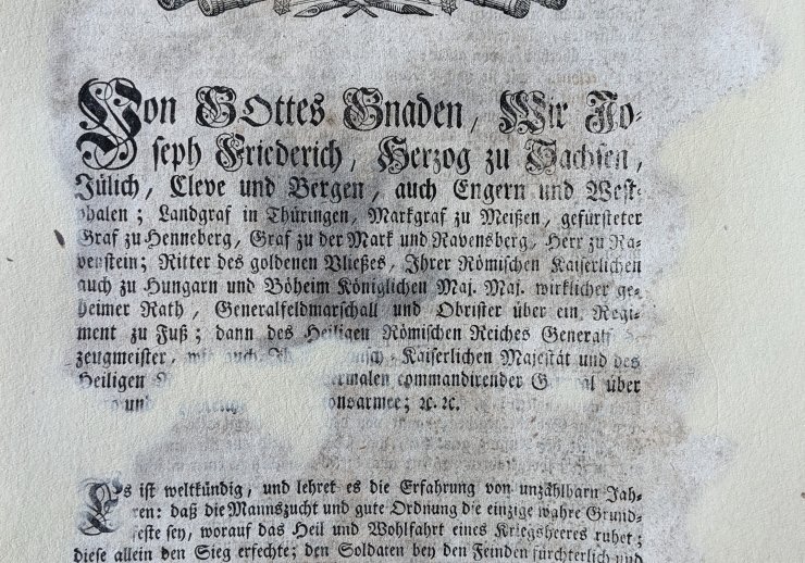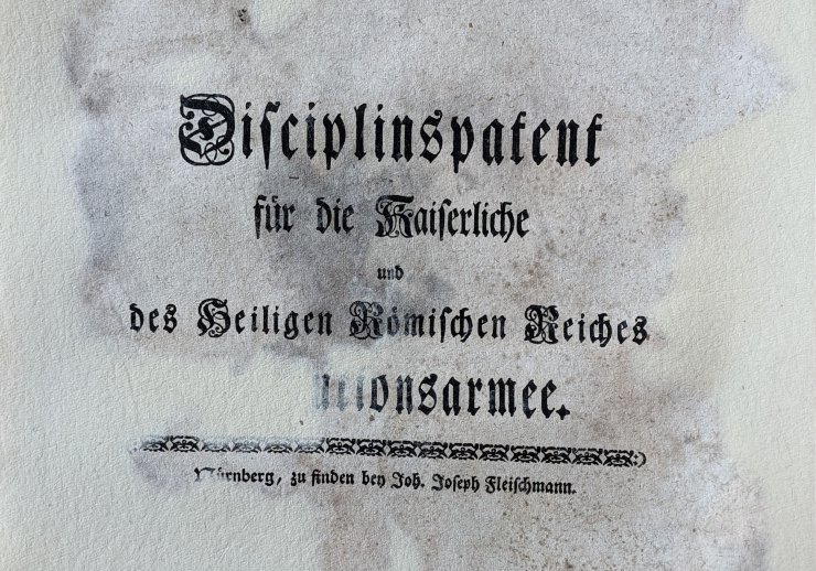 Im „Disciplinspatent für die Kaiserliche und des Heiligen Römischen Reiches Reichsexecutionsarmee“ von 1757 erläutert der Herzog Joseph Friedrich zu Sachsen, wie er sich die Herstellung von „Mannszucht und gute(r) Ordnung“ innerhalb der Reichsexekutionsarmee vorstellt. Auf ihr beruhten seiner Ansicht nach „das Heil und die Wohlfahrt eines Kriegsheeres“ denn „diese allein den Sieg erfechte“. In 37 Einzelpunkten beschreibt er, wie die nötige Disziplin unter den Soldaten und den Offizieren herzustellen sei.