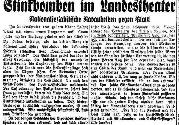 Der aus Detmold gebürtige, inzwischen reichsweit bekannte Vortragskünstler Josef Plaut hatte auch das weit über Lippe hinaus bekannte Spottlied auf die „Lippischen Schützen“ im Repertoire. Das Lied wurde in beiden Weltkriegen von den Lippern an der Front gesungen oder gerne gehört. Dass es 1932 von einem jüdischen Künstler vorgetragen werden sollte, nahm die Ortsgruppe Detmold der NSDAP zum Anlass, die Aufführung zu stören und damit auf sich aufmerksam zu machen. Da die NSDAP im Reich und im benachbarten Preußen gleichzeitig um bürgerliche Wähler warb, ohne die sie keine Parlamentsmehrheiten erreichen konnte, wurden die Beteiligten parteiintern bestraft.