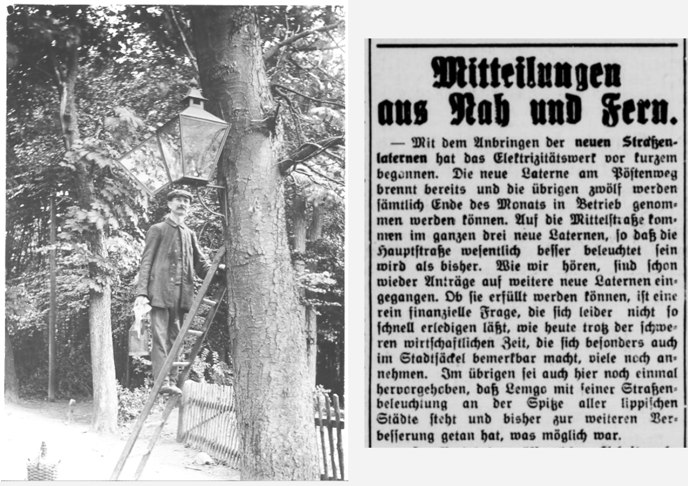 Der Beruf des Laternenanzünders oder Laternenputzers ist heute weitestgehend unbekannt. Aber bevor die Straßenbeleuchtung elektrisch wurde, musste jede einzelne Straßenlaterne, mit Öl oder Gas betrieben, bei Einbruch der Dunkelheit händisch angezündet und morgens auch wieder gelöscht werden. Damit die Helligkeit der Lampen nicht beeinträchtig war, mussten diese auch kontinuierlich gewartet und sauber gehalten werden. Auf dem Foto, das um das Jahr 1900 entstand, sieht man einen Lampenputzer in Lemgo. Der Beruf des Lampenanzünders blieb noch bis in die 1960er Jahre hinein relevant. Die Stadt Lemgo führte allerdings schon recht früh eine elektrische Straßenbeleuchtung ein. Ein Artikel aus der Lippischen Post vom 10. Oktober 1925 berichtet sogar, dass der Ausbau kontinuierlich vorangetrieben werde und Lemgo „mit seiner Straßenbeleuchtung an der Spitze aller lippischen Städte“ stehe.