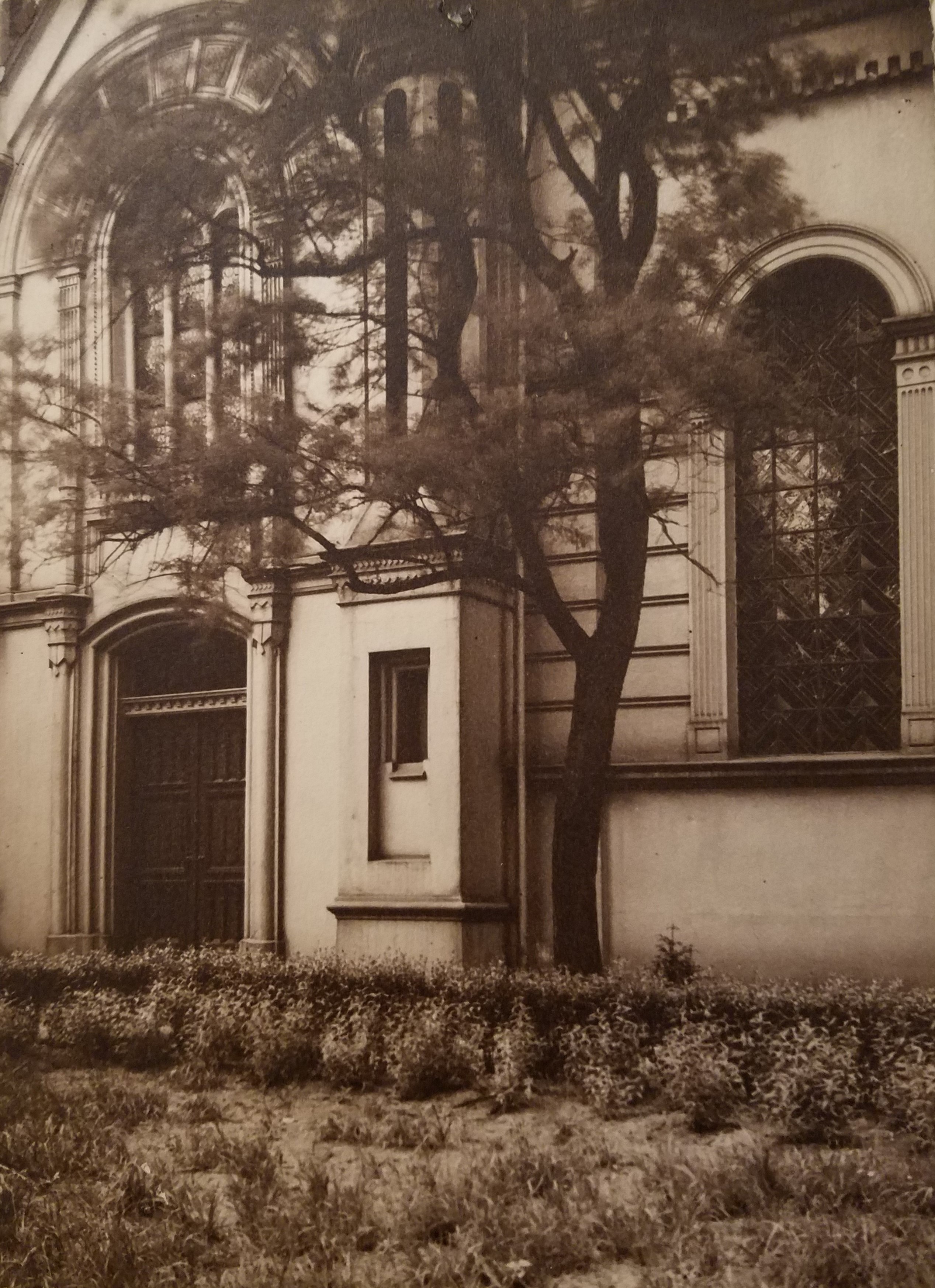 Zur Zeit der Fotoaufnahme war der Eingang der Synagoge mit zwei oktogonalen Türmchen eingerahmt. Über dem Eingang mit der Doppeltür ist ein prachtvolles Rundbogenfenster zu erkennen.