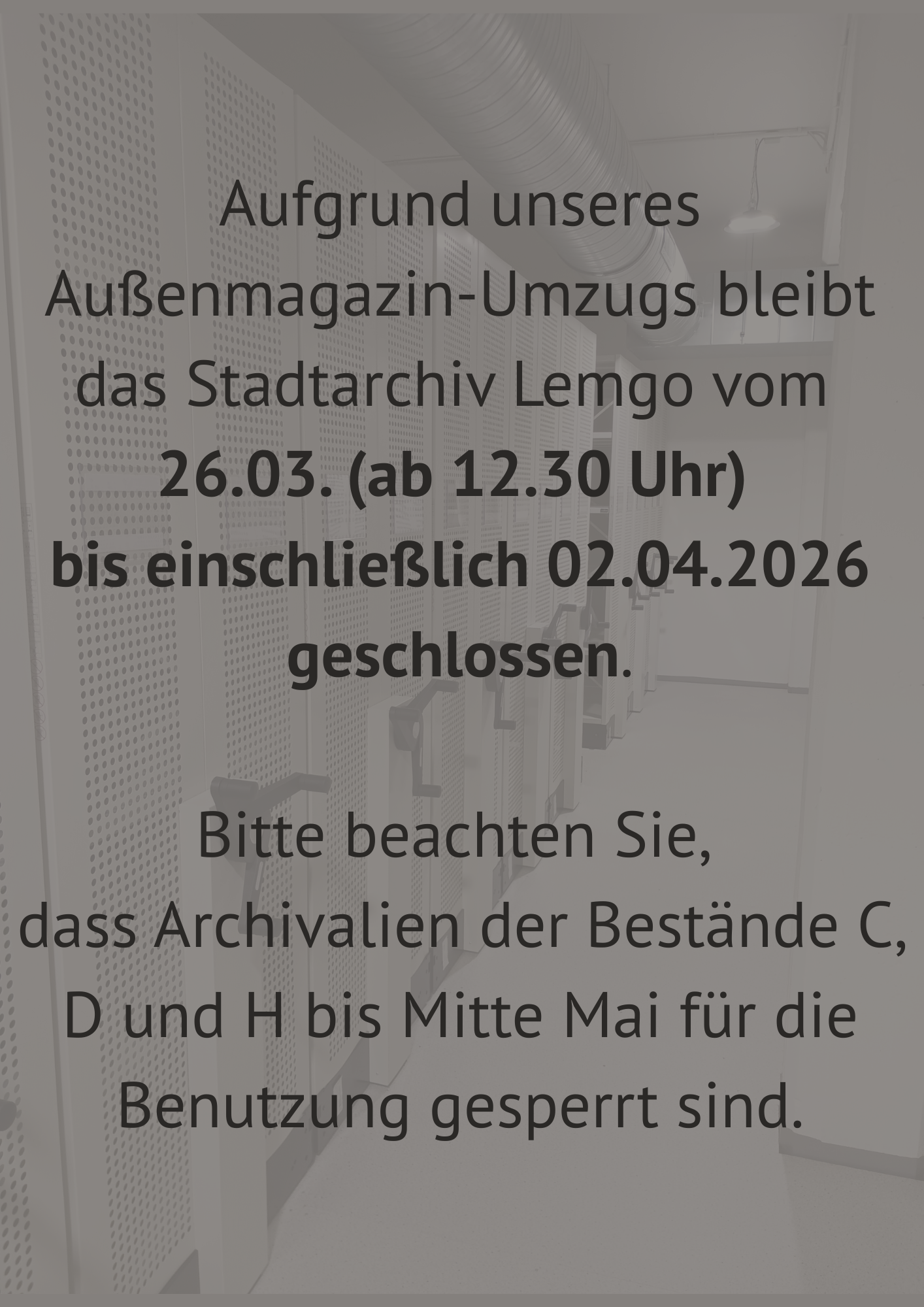 Aufgrund unseres Außenmagazin-Umzugs bleibt das Stadtarchiv Lemgo vom 26.03. (ab 12.30 Uhr) bis einschließlich 02.04.2026 geschlossen.