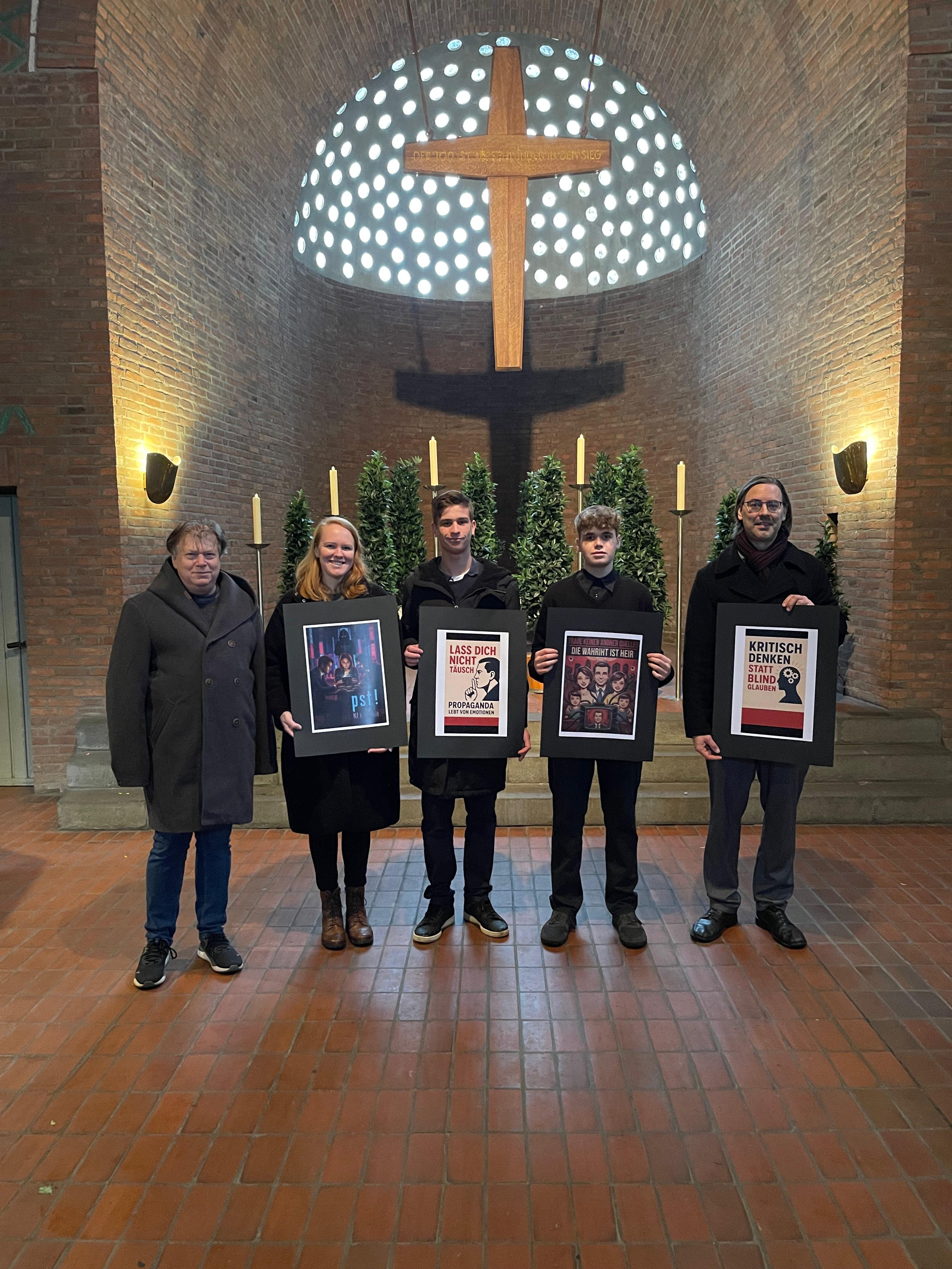 Zu der Andacht auf dem Friedhof Goethestraße am diesjährigen Volkstrauertag, dem 16.11.2025, hat das Stadtarchiv Mettmann in Zusammenarbeit mit Herrn Andreas Scherer und Schülern aus dem KHG-Club eine Lesung beigetragen. Im Rahmen der Bildungspartnerschaft, die seit Beginn des Jahres besteht, hatten die Schüler sich ein halbes Jahr lang mit dem Volkstrauertag beschäftigt und sich für einen eigenen Beitrag zum Thema „Kriegspropaganda“ entschieden. Unter Anleitung des Stadtarchivs entstanden vier Plakate, die mit Hilfe von künstlicher Intelligenz durch die Schüler erstellt wurden, und zum Nachdenken anregen sollen. Als Vorlage hatten authentische Propaganda-Plakate aus dem 2. Weltkrieg gedient. Stadtarchivar Betker betonte, wie die modernen Kriege mit Mitteln der Kriegspropaganda geführt werden und dass es „die Jungs am meisten bewegt hat“. Anschließend verlasen die Schüler die Plakate in der Friedhofskapelle. Die Arbeitsergebnisse sollen noch nachgenutzt werden im Rahmen einer kleinen Ausstellung im Foyer des Ratssaales im Rathaus.