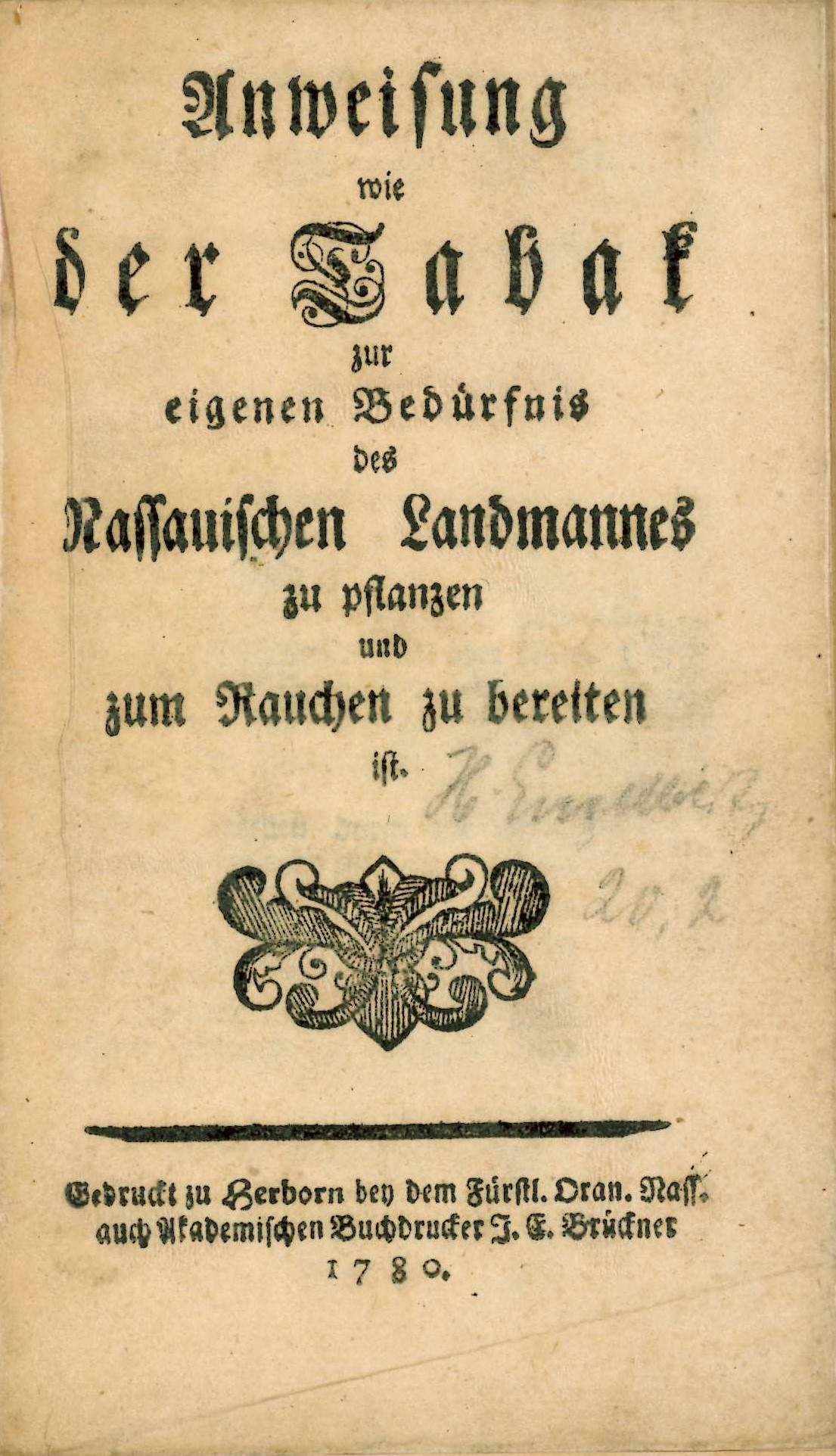 Dienstag, 6. Januar 2026 - 14:19Eine seltene Druckschrift im Bestand des Stadtarchivs Siegen verdeutlicht, dass schon vor zweieinhalb Jahrhunderten im Fürstentum Nassau-Oranien der Anbau von Tabakpflanzen beworben wurde. Die 1780 in Herborn gedruckte Broschüre „Anweisung wie der Tabak zur eigenen Bedürfnis des Nassauischen Landmannes zu pflanzen und zum Rauchen zu bereiten ist“ ist Bestandteil der Historischen Bibliothek des Stadtarchivs, in der sie unter der Signatur-Nummer 1283 geführt wird. Schriftliche Nachweise über den „Empfang von Tabak“ datieren bereits in das 17. Jahrhundert zurück, wie Warenrechnungen berichten. Neben Malz, Hopfen, Wolle, Hanf, Bier, Essig, Wein und Lederhäuten wurden beispielsweise im Jahr 1690 auch mehrere „Centner Tabak“ nach Siegen gebracht, wie die Stadtschöffen notierten. Die Erzeugnisse wurden damals entweder von einem „Cöllnischen Fuhrman“ oder von „Italianer, Frantze [Franzosen] undt Juden“ nach Siegen transportiert. Doch erst einhundert Jahre später wurde augenscheinlich der Versuch unternommen, den Anbau mit landesherrlicher Genehmigung auch im Siegerland zu fördern und zu reglementieren. Ausdrücklich wird in der Druckschrift aus dem Jahr 1780 beispielsweise vor dem sogenannten „türkischen Tabak“ mit seinen dunkelgrünen Blättern und seiner berauschenden Wirkung gewarnt. Die Broschüre trägt den Charakter einer erzieherischen Maßnahme nassau-oranischer Zeit, um möglichen Missbrauch vorzubeugen. Offenbar handelte es sich schon damals um ein lukratives Geschäft. Zu Jahresbeginn 1798 kündigte der Siegener Tabakfabrikant Johann Henrich Schweisfurth die Eröffnung einer Tabak-Schule auf der Sieghütte an. Seine Motivation: Durch einen erlernten Umgang mit Tabakpflanzen sei man besser imstande, „unächte, schlechte, manchmal durch allerhand Schmierereyen und schädliche Farben verfälschte, der Gesundheit nachtheilige Waare“ aus dem Verkehr zu ziehen, wie es in einer Presseannonce vom 6. Januar 1798 in den „Dillenburgischen Intelligenz-Nachrichten“ heißt. Denn längst hatte man auch unter dem Siegener „Krönchen“ erkannt, dass Rauchtabak „zu einem wichtigen Handels-Artickel geworden ist“, so Johann Henrich Schweisfurth.